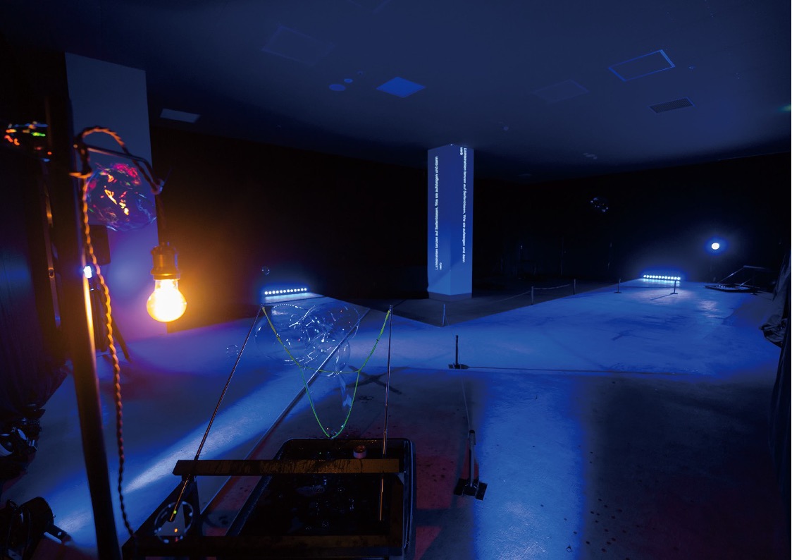 AI によってコントロールされた5つのシャボン玉生成器がシャボン玉を自動的に生成しては消え、消えては生成する。その空間の中でAI がリアルタイムに詩をつくり、その詩を朗読する。展示会場は羽田空港に近く、しばしば大きな機影を望める立地である。そのため、朗読は日本語も含め多言語で行うようにした。シャボン玉は命の輝きを象徴しており、生命が誕生し、亡くなっていくまでの一期一会の瞬間を演出する。